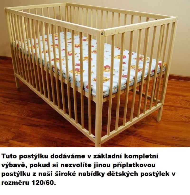 Dětská dřevěná postýlka 120/60 cm je vyrobena z kvalitního borovicového masivu. Rošt je stavitelný ve třech pozicích, dvě středové příčky jsou vyjímatelné přes pružinový mechanizmus. Vyjímatelné 2 středové tyče jsou výhodou pro starší děti, které si samy bezpečně z postýlky vyjdou ven, nebo vlezou do postýlky. Postýlka je opatřena ekologickým atestovaným lakem.